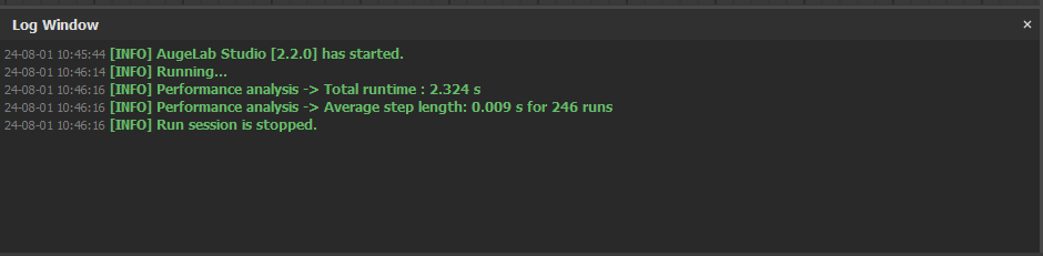 La Log Window está ubicada en la parte inferior de la interfaz y muestra registros en tiempo real, advertencias y mensajes de error relacionados con tus flujos de trabajo.