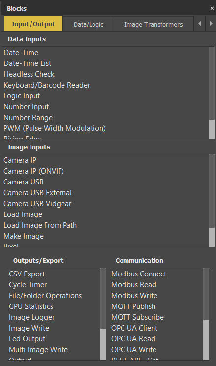 La Blocks Window se encuentra en el lado izquierdo de la interfaz y contiene una colección de bloques que puedes usar en tus flujos de trabajo.