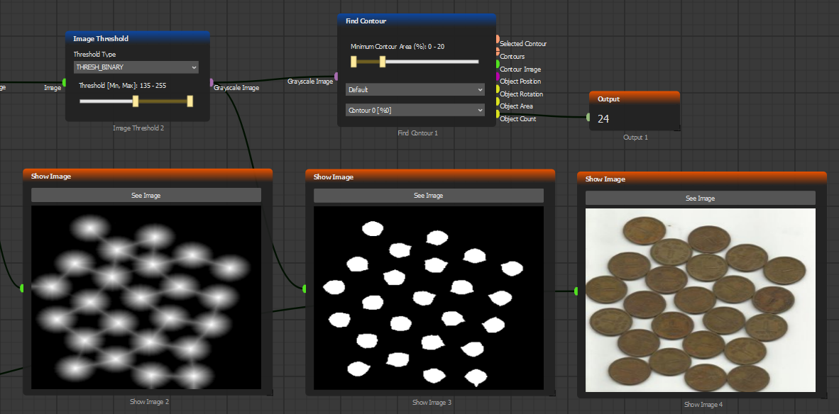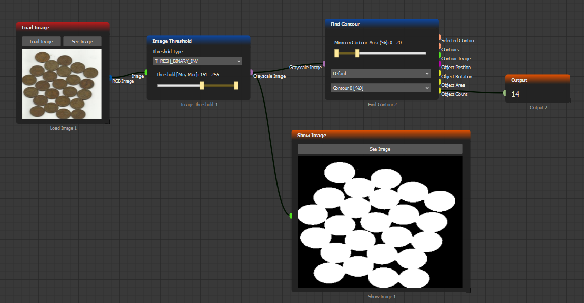 Como primer paso, necesitamos separar las monedas del fondo usando el bloque Image Threshold. Esto también puede hacerse con HSV Filter o RGB Mask, pero separar las áreas de color y obtener una imagen binaria será suficiente. Crea la lógica que aparece a continuación: