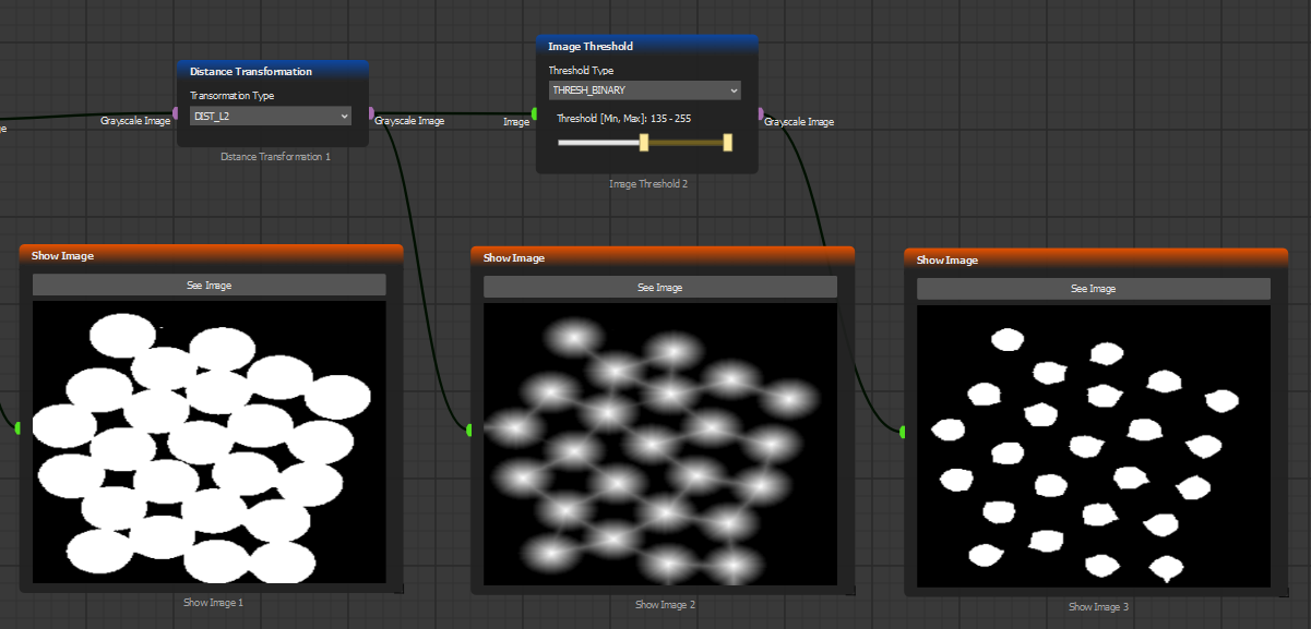 Como ves, no hay 14 monedas claramente separadas en la imagen proporcionada. Necesitamos un algoritmo que separe o encoja las áreas blancas. Para esto usaremos el bloque Distance Transformation: