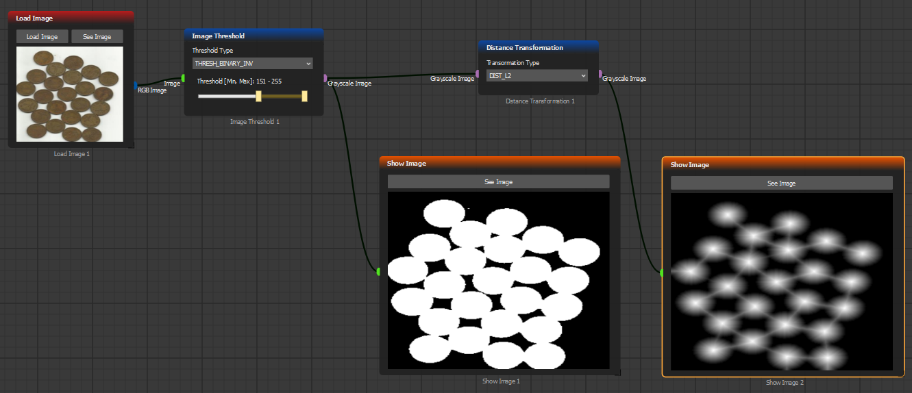 La transformada de distancia calcula qué tan lejos está cada píxel de la densidad de color blanco. Volver a usar [Image Threshold](https://docs.augelab.com/spanish/function-blocks/blocks-reference/image-transformations/color-filters/image-threshold) sobre el resultado producirá áreas blancas separadas para cada moneda: