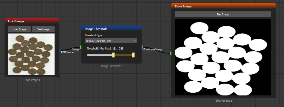 Como primer paso, necesitamos separar las monedas del fondo usando el bloque [Image Threshold](https://docs.augelab.com/spanish/function-blocks/blocks-reference/image-transformations/color-filters/image-threshold). Esto también puede hacerse con [HSV Filter](https://docs.augelab.com/spanish/function-blocks/blocks-reference/image-transformations/color-filters/hsv-filter) o [RGB Mask](https://docs.augelab.com/spanish/function-blocks/blocks-reference/image-transformations/color-filters/rgb-mask), pero separar las áreas de color y obtener una imagen binaria será suficiente. Crea la lógica que aparece a continuación: