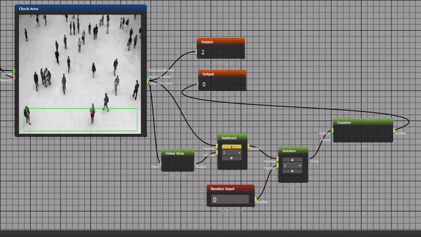 Videomuzda birçok insan tespiti gördüğünüzü fark edebilirsiniz. Ancak, kameramızın perspektifinden ne kadar insanın içeri girdiğini veya dışarı çıktığını saymak istiyoruz. Bunu başarmak için Check Area bloğunu kullanacağız: